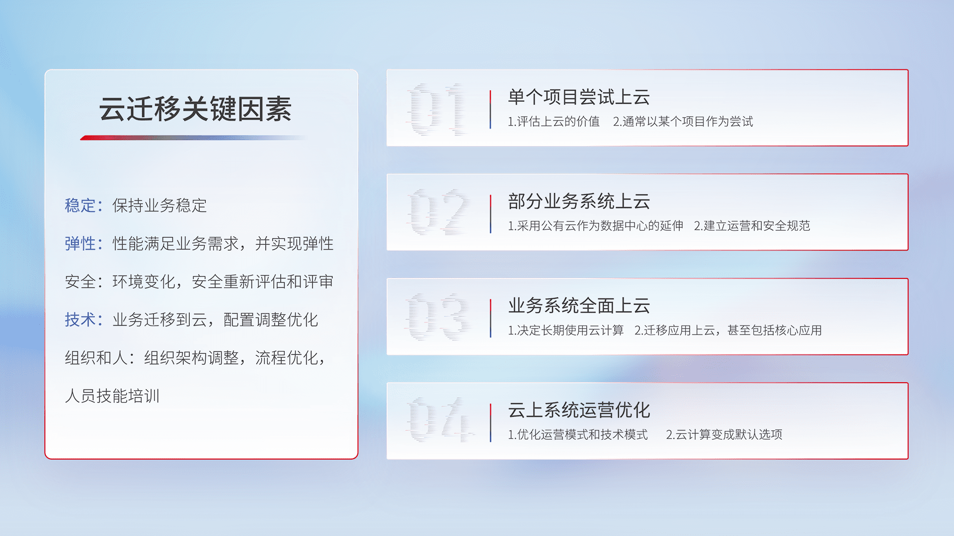 结合实际业务,,,从规划设计、、、、云平台选型、、云原生改造、、、数据迁移、、、集成交付,,迁移全过程为客户识别最佳上云路径,,,做好风险识别管理,,,,设计网络架构、、身份权限、、安全审计合规、、、、操作审计、、、日志审计、、、、监控告警策略、、、、多站点容灾设计等,,,对云上基础设施进行整体规划,,,提升IT治理水平,,,以满足弹性、、、高可用、、、高性能的需求。。