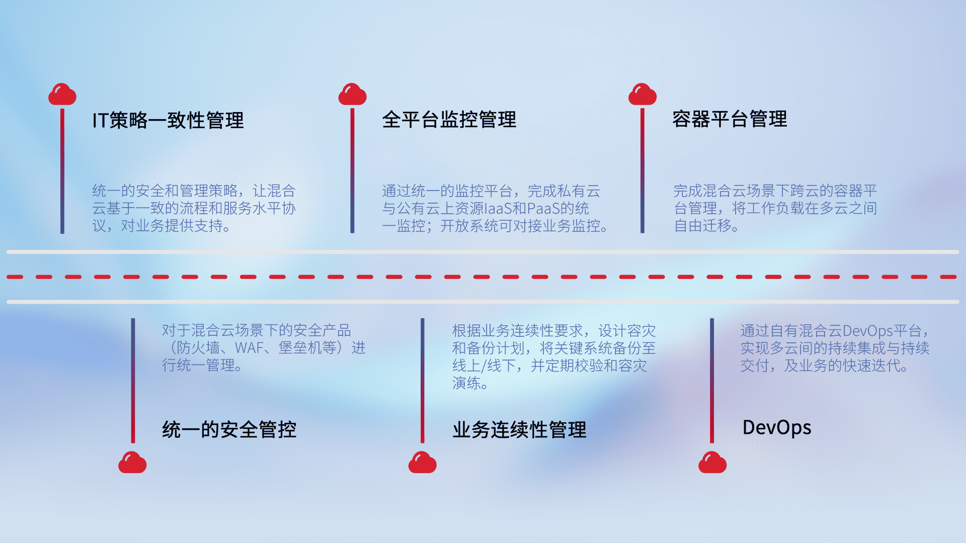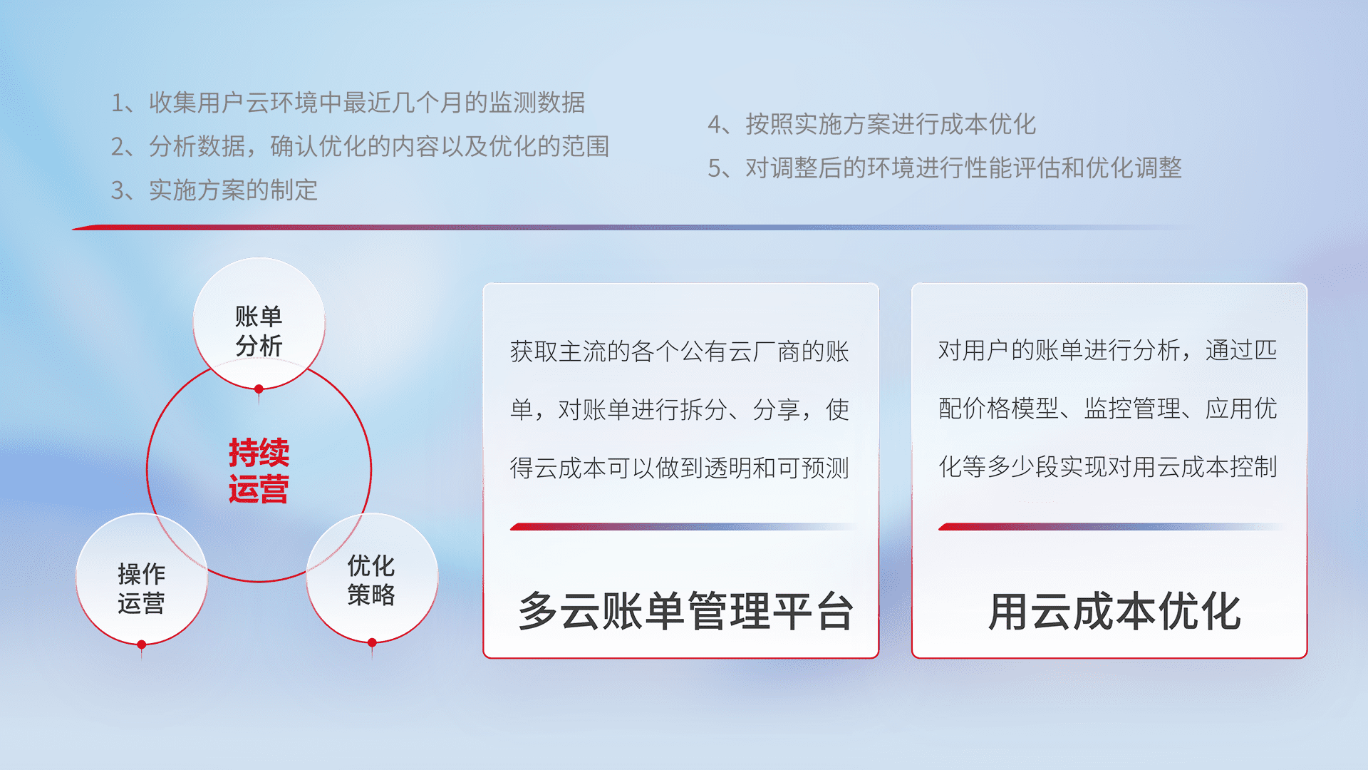 通过多云纳管,,,以统一的资源数据模型把客户的云资源进行抽象和封装,,进而实现对多云资源的统一操作,,,,保障云资源管理的可靠性、、稳定性与可用性。。。量身定制化运维内容,,配置、、、开发运维、、补丁管理、、、备份、、监控、、、、认证和访问管理、、、审计和日常巡检等,,,保障在用云过程中的可靠度,,,稳定度以及高可用率。。